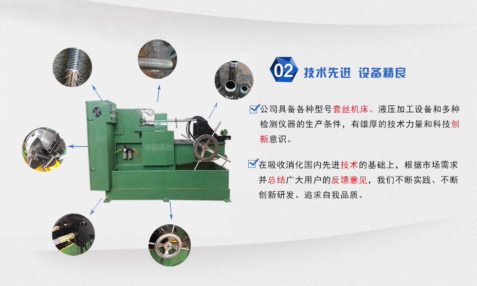 本套絲設備屬于無削加工設備,運用特殊的切削技術,上絲輕盈快捷,提高生產效率,采用三點一線,同心度高,性能穩(wěn)定等優(yōu)點,本機每分鐘可切削3-5根工件,速度快,效率高,對于一些不定長度的鋼結構公司,橋梁工程,電力設施等大企業的批量生產之需要。